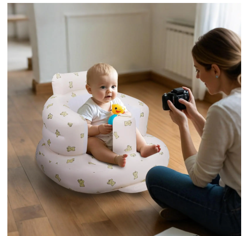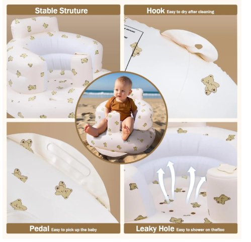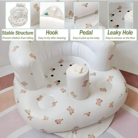 This baby seat is amazing! So easy to pump up and it stays in inflated. Super easy to deflate if you need to. Love this when she is trying to sit up. Keeps her in safely and easy to take outside to sit in and when we started doing foods, when she was a little too small for the highchair. So easy to clean when it gets dirty